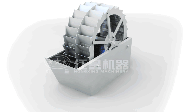 工作时,电机通过三角带、减速机、齿轮减速后带动叶轮缓慢转动,河卵砂由给料槽进入洗槽中,在叶轮的带动下翻滚,并互相研磨,除去覆盖砂石表面的杂质,同时破坏包覆砂粒的水汽层,以利于脱水;同时加水,形成强大水流,及时将杂质及比重小的异物带走,并从溢出口洗槽排出,完成清洗作用。干净的砂石由叶片带走,砂石从旋转的叶轮倒入出料槽,完成砂石的清洗作用。