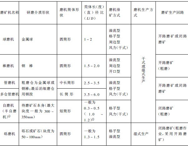 圆筒型磨机(简称磨机)规格以筒体内(直)径和内长(度)尺寸表示。工业生产中广泛应用的磨机种类很多,分类方法亦不相同,有的按照研磨介质的形状分类,有的根据筒体形状分类,有的按排矿方式分类,也有根据磨矿生产方式分类。各类磨机的主要类型和圆筒型磨机的分类方法,分别如图1 和表1所示。
