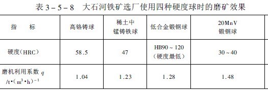 表3-5-8说明:1)不同硬度钢球有不同磨矿效果,但并非硬度极大的效果好,而是硬度恰当时效果才好,20MnV锻钢球生产率高,但HRC仅30—40,硬度恰当。2)不同硬度钢球之间磨机利用系数(即容积生产率)可相差20%—40%,说明硬度对磨机生产率的影响是相当显著的,单纯追求高硬度低球耗而忽视生产率降低是不可取的。