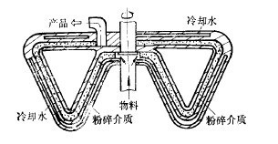 环型磨机的外形很象W形状(图1),是近几年研制的一种新的超细磨设备。该设备主要特点是磨机筒体由类似 形的内、外层的环型部分组成。磨矿之前,将待粉碎的物料(矿浆)与研磨介质(玻璃球等)同时给入环形筒体内,由于内层筒体的旋转运动,使处在狭窄缝隙中的物料,受到均匀的剪切作用而被磨碎。磨机外层筒体制成带有缝隙的双层环形部分,向缝隙中加入冷却水,冷却效果良好。这类磨机依靠磨机筒体本身具有强烈的自转和公转而使研磨介质产生巨大的冲击、研磨作用而磨碎物料。