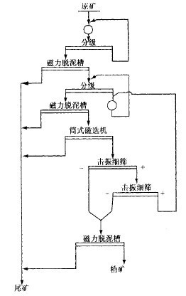 该种类型矿石中,主要有用矿物是磁铁矿,含少量赤铁矿;脉石矿物主要是石英,含少量角闪石、绿泥石、方解石、云母、绿帘石和磷灰石。矿石呈带状构造,由铁矿物层和脉石层的互层组成。铁矿条带厚度平均为0.5-0.8mm,非铁矿条带厚度平均为0.2-0.4mm。铁矿物呈细粒嵌布,嵌布粒度为0.1mm左右。工艺流程见图1。按照该流程所达到的选矿指标是:当原矿品位为30%Fe时,精矿品位达68%Fe,回收率82%Fe左右。
