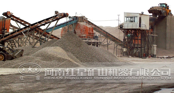 物料由振动给料机送入颚式破碎机进行初步破碎,二级破碎则由圆锥破碎机完成,经圆锥破破碎的物料进入圆振动筛进行筛分,大于40mm的物料返回圆锥破重新破碎,形成闭路循环,小于40mm的物料进入立式冲击破碎机进行整形破碎。立式冲击破破碎的物料经成品振动筛筛分后,大于20mm的物料经皮带输送机送到各个成品料堆。