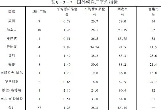 用浮选方法处理炼铜废渣回收金属,是近年来发展的一种新工艺。日本已在八座冶炼厂建立了处理炉渣的选矿车间。芬兰的哈里亚伐尔塔厂以前用电炉贫化铜炉渣、将渣含铜降到0.6-0.7%,铜的回收率77%,后来改用浮选处理,尾矿含量降到0.3%(渣含铜)铜回收率提高到91.1%。一些国家铜选厂1981年的生产指标列于表9-2-7。