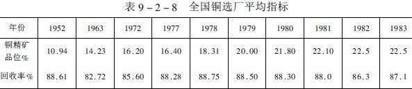 (2)国内铜选矿现状我国现有32座大中型铜选厂,年产方吨以上精矿含铜量的有铜录山、德兴、白银、易门、落雪等选厂。口处理量在3000吨以上的有13座,500-3000吨的有15座。矿石入选品位平均为0.94%,虽然原矿品位逐年下降,但铜精矿品位则随着选矿工艺的发展和技术进步而逐年提高,如表9-2-8所列。