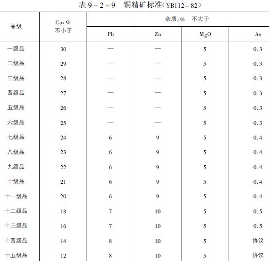 送往冶炼厂的铜精矿,由于矿石产地,矿石种类和选矿技术条件的不同,其化学成分和矿物组成是极其复杂的。冶炼广对这些化学成分和矿物组成不作具体规定,仅根据冶炼方法,冶炼工艺特点及冶炼技术的不同,对某些成分加以适当限制。但出于冶炼对精料的要求,以及对选冶联合成本的考虑,对入厂精矿的含铜品位规定了十五个等级(表9-2-9)。