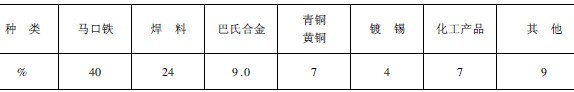 锡几乎可与所有的金属形成合金,其中主要有焊锡、锡青铜、巴氏合金、铅锡轴承合金、印刷合金等。此外,钛基合金、铌锡合金和锡银汞合金等在原子能工业、航空工业、超导材料和医疗方面均有各自的用途。锡的化合物中主要的是二氧化锡(SnO3),其次为四氯化锡(SnCl4,氯化亚锡(SnCl2)和锡的有机化合物。这些化合物分别可作瓷釉的原料、印染工业的媒染剂、塑料的热稳定剂以及杀虫剂和杀菌剂等。据统计,目前锡的主要用途和所占比例列于表9-2-32。
