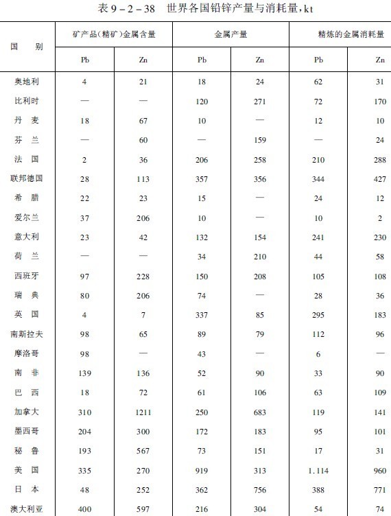 随着科学的进步和工业生产的发展,世界各国对铅锌的需求量每年虽有起伏,但总的趋势是不断增加,因而促进了铅锌矿冶工业的发展。1984年27个国家的铅锌矿产品(精矿)金属含量,金属产量,精炼的金属消耗量列于表9-2-38。