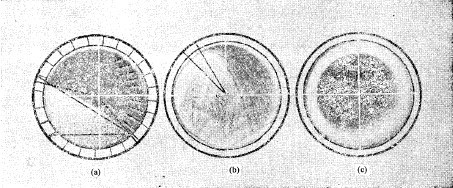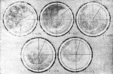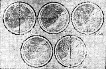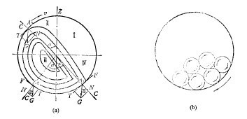 如果磨机的转速不高,全部球荷向上偏转一定角度,其中每个钢球都绕自己的轴线转动。当球荷的倾斜角超过钢球在球荷表面上的自然休止角时,钢球即沿此斜坡滚下。钢球的这种运动状态,叫做泻落,如图1中的(a)。在泻落式工作的磨机中,矿料在钢球间受到磨剥作用。如果磨机的转速足够高,钢球自转着随筒体内壁作圆曲线运动上升到一定高度,然后纷纷作抛物线下落。钢球落下的地方,叫底脚区,其中的钢球强烈地翻滚。这种运动状况,如图1中的(b),叫做抛落。在抛落式工作的磨机中,矿料在圆曲线运动区受到钢球的磨剥作用,在底脚区受到落下的钢球的冲击和强烈翻滚着的钢球的磨剥。倘若磨机的转速高到超过某一临界值,钢球就贴在衬板上不再落下。这种状态叫离心运转,如图1中的(c)。发生离心运转时,矿料也是贴着衬板的。以上这些情形,都是指磨机内装有一定数量的钢球说的。要是磨机内只有少量的球,它们只是在磨机内的低点摆动,并不发生上面讲的三种情况。用拍摄磨机内的介质的运动状态来研究它的运动规律,本世纪的二十年代已经开始,豪尔太恩、戴维斯、列文逊和我国的王仁东,都先后做过这方面的工作。 钢球作泻落式运动的力学尚缺乏研究,以后只讲抛落式的。 再详细地看看下面几张关于抛落式和离心运转的照片。