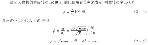 即角a标志钢球开始抛落时已升到的位置,叫做脱离角。公式(2-5)指出,转速率愈高,脱离角愈小,钢球上升到的位置愈高。当脱离角为0。时,转速率为1,即实际转速已等于临界转速,钢球到了磨机的顶点,要开始离心化了。