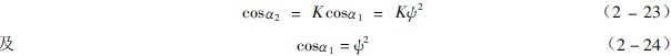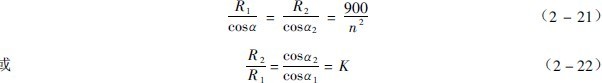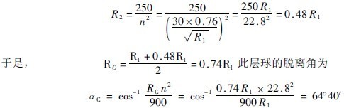 每一层球有一球层半径和相应的脱离角,它们的关系符合公式(2-17)。设外层球的半径为R1,脱离角为a1,内层球的半径为R2,脱离角为a2,在磨机的每分钟转数为n 时,根据公式(2-17),必有下述关系