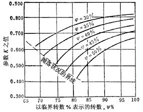 这两个公式指出:外层球的脱离角仅与转速率有关,而内层球的脱离角,即与转速率又与装球率(用K标志)有关。根据上面讲的情况可知,为了保证内层球也能处于抛落状态(即所有球层都是抛落的),装球率与转速率必有一确定关系。而且这种关系又必有临界点,过了这种临界点,磨机的转速不足以使晕内层球作抛落,钢球于是处于泻落状态。这里将用计算结果