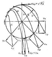 当钢球以速度vp到达落回点时,它的动能分解为两部分:一部分沿打击线OB(通过物体的打击接触点,并垂直于接触面的直线)冲击矿石;另一部分与打击线垂直,使钢球沿切线方向运动,这部分使矿石受磨剥而没有冲击作用。如果把vp分解为沿打击线的径向分速度vn和沿切向分速度v1,求出这两个分速度,就可以知道冲击矿石的能量和磨剥矿石的能量各占若干。