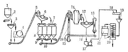 物料合并,用带式运输机5送到贮矿仓8。为了给自磨机配矿,在贮矿仓8上设有振动筛6,将粗碎后的原矿分成为350-100毫米与100-0毫米两个级别(即人工配比),分别用可逆带式运输机7卸入贮矿仓8内。存于矿仓内的矿石由电振给矿机19按比例给到集矿带式运输机10,输送到自磨机11内。自磨机与直线振动筛12构成半闭路循环,自磨机的排矿经直线振动筛12分级后,筛上产物在由三条带式运输机13、14、16返回自磨机的过程中,在第二条带式运输机14的首轮处安有磁滑轮15,筛上产物被分成为磁性产物和非磁性产物,磁性产物返回自磨机再磨,非磁性产物接近尾矿品位,故丢弃。直线振动筛的筛下产物用泵17扬到矿浆分配器18,经永磁磁力脱水槽19脱泥后自流到第二磨矿段,第二磨矿段为螺旋分级机20作预先检查分级与格子型球磨机21,组成的闭路循环。分级溢流细度为80%-200目,为自磨系统合格产物。