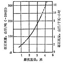 砾介的消耗与砾的物理性质、机械性质、砾介的粒度、磨矿浓度、磨机的直径、衬板的结构及磨机的转速率等有密切的关系。抗磨性和冲击强度差的矿石,自然会使砾介的消耗量大,并在一定的情况下,可能使第二段砾磨成为不可能。砾介的粒级愈粗,砾介的消耗量愈大。如某矿第一段砾磨机的砾介粒度为80-250毫米时,砾介的消耗量为47公斤/千瓦时;而在第二段砾磨机的砾介粒度为40-80毫米时,砾石耗量为17公斤/千瓦时。磨矿浓度愈低,砾介间的接触愈多,砾介磨损也愈快。尤其值得注意的是,砾介的消耗随磨机直径的加大而迅速增加,如图3-3-16所示,砾石耗量是磨机直径的函数,当磨机直径增加50%时,砾石的消耗量加倍。此外,砾介的消耗量随磨机转速率的增加而增加。提升衬板越高,砾介耗量也越大。如有一硫化矿的第二砾磨,装有80毫米高的新橡胶提升板,与低波纹形剖面已磨损的衬板相比,前者的砾石耗量为后者的两倍。