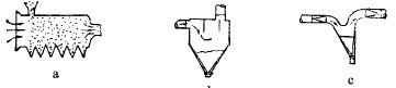图3-4-5示出几种简单的有代表性的重力风力分级器。图3-4-5a所示的分级箱,原料从上部给料斗中给入,在水平气流作用下,粗粒落下的地点近,细粒落下远,不能落下的微细粒被气流带走。分段截取,可得多个不同粒级产物。这种分级箱用于处理较粗的物料。图3-4-5所示的分级器,颗粒随气流一起进入分级器,由于过流断面突然增大和挡板的阻滞作用,气流速度减慢,粗粒在重力和惯性力作用下沉落,细粒被气流带走。图3-4-5a和e表示的是在上升气流中进行的分级器。前者得两种产物;后面一种,物料从上,气流从下部供入,可得三产物。