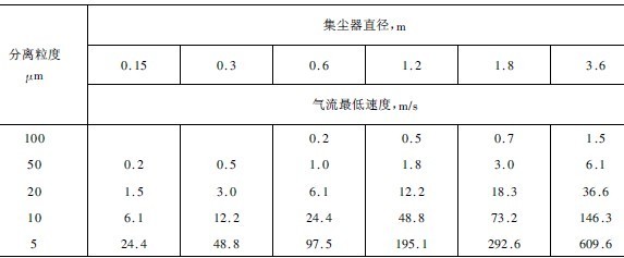 表3-4-9旋风集尘器气流入口速度与分离粒度的关系