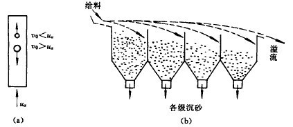 分级过程的示意图见图3-4-11(a),沉降末速大于上升介质流速的矿粒下沉到分级设备的底部,作为沉砂或底流排出;沉降末速小于上升介质流速的细粒级产物从上端溢出,成为溢流。如果要得到多个粒级产物,则可将溢流(或沉砂)在依次减小(或增大)的上升水流中继续进行分级。